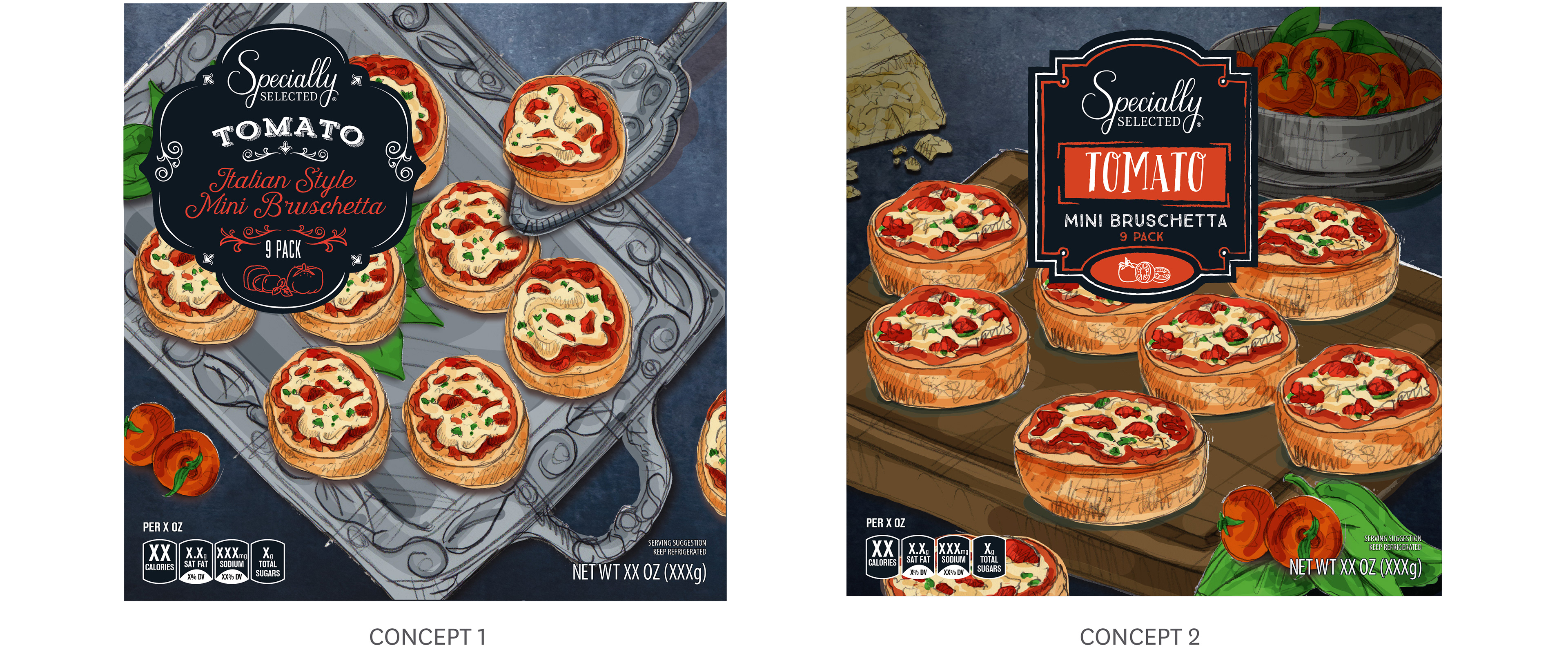 Aldi wanted to add two new lines to their Specially Selected line up, these were frozen Special Buy items. Adhering to the new guidelines for the 'Selected' brand, I was asked to created two design options with a device shape/placement with fonts and photography. The photography should be moody with antique propping which will also flex to different styles per concept, the two concepts should feel very different from one another.