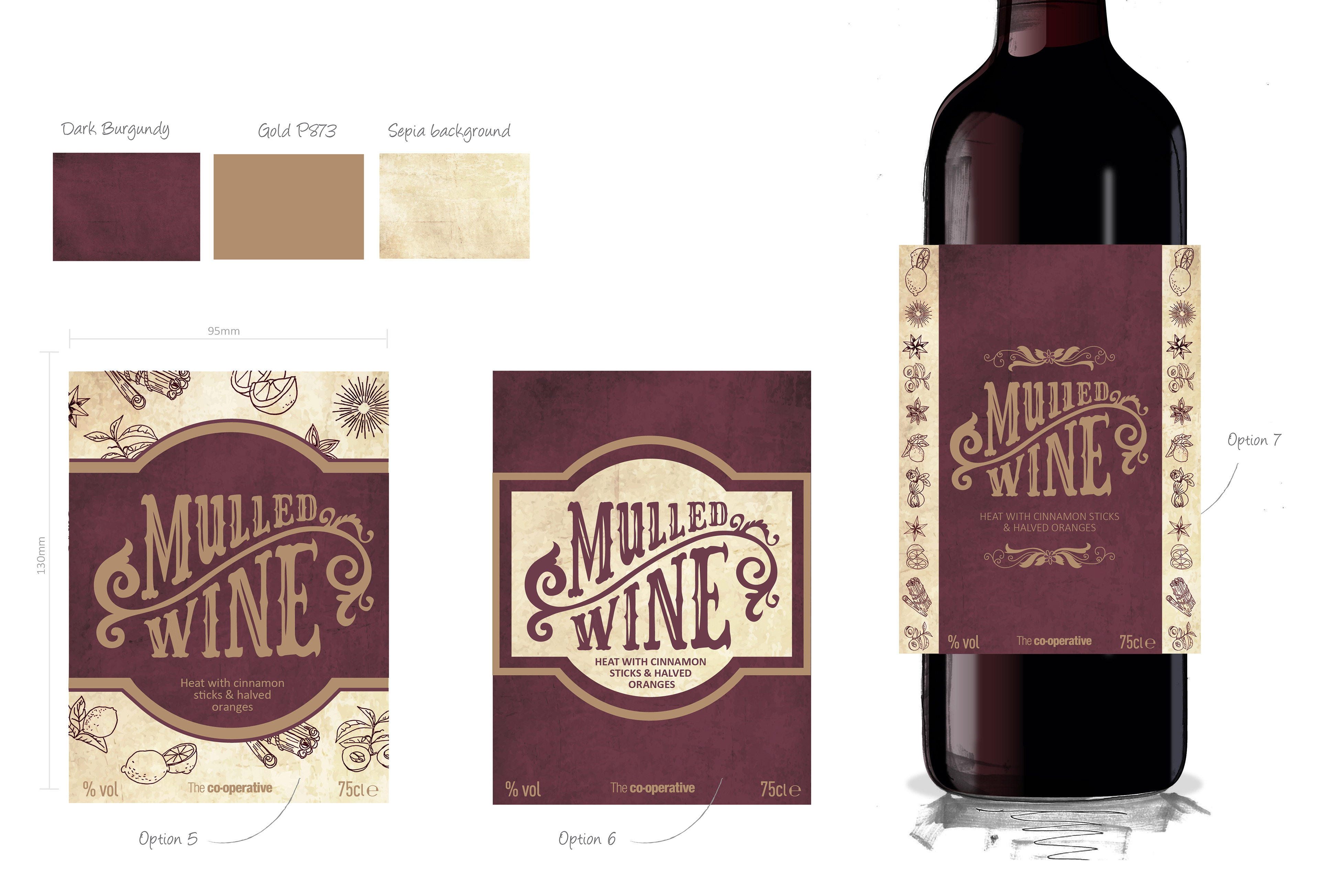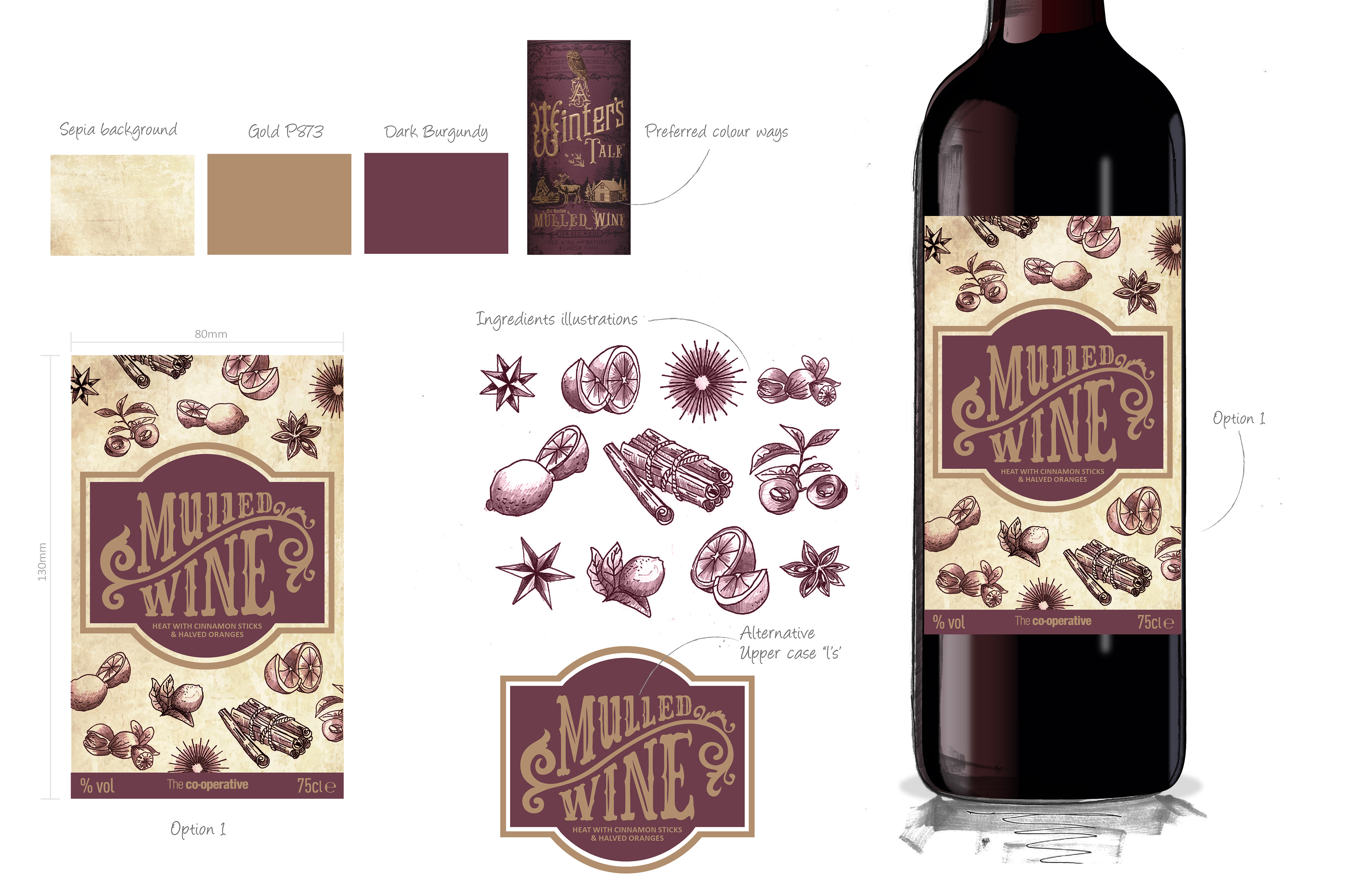 Having studied the present mulled wine market, I was tasked by The Co-op to design the label for their seasonal offering of Mulled Wine, I produced several concepts based on the themes such as ' A winter's celebration'.